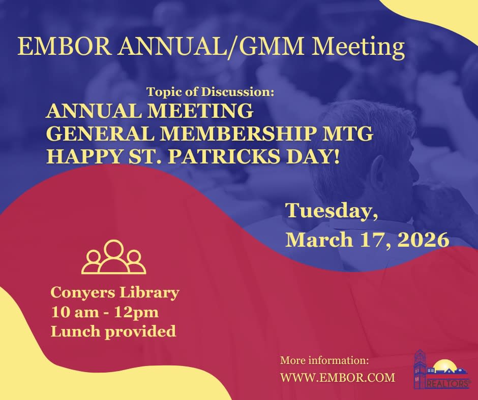 Save the Date: !st Quarter EMBOR Annual and General Membership Meeting, Tuesday, March 17, 2026 | 10 AM – 12 PM Location: Nancy Guinn Memorial Library 864 Green St SW, Conyers, GA 30012 Join EMBOR as we start the new year with Updates from the GAR conference. Enjoy the St. Patrick's Day theme. Lunch will be provided. ✨ Special thanks to our event sponsor, Jason McCart, McCart Law Firm, for their generous support and commitment to our REALTOR® community! ✨ Mark your calendars.